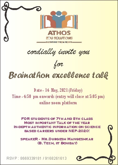 To provide and promote education for the society, with balanced and accurate information pertaining to the student's career, Bharati Vidyapeeth, Balewadi and Athos Edu Solutions had a Brainathon excellence talk and thereby conducted a meeting with teachers and students of Class 7 and 8 respectively, on 10th May 2021. Followed by students registering for an in-depth session of discussion on 14 May on Zoom platform for an authentic information on science-based careers under NEP-2020. The speaker for the session is. Mr Durgesh Mangeshkar. (B Tech, IIT Bombay.)